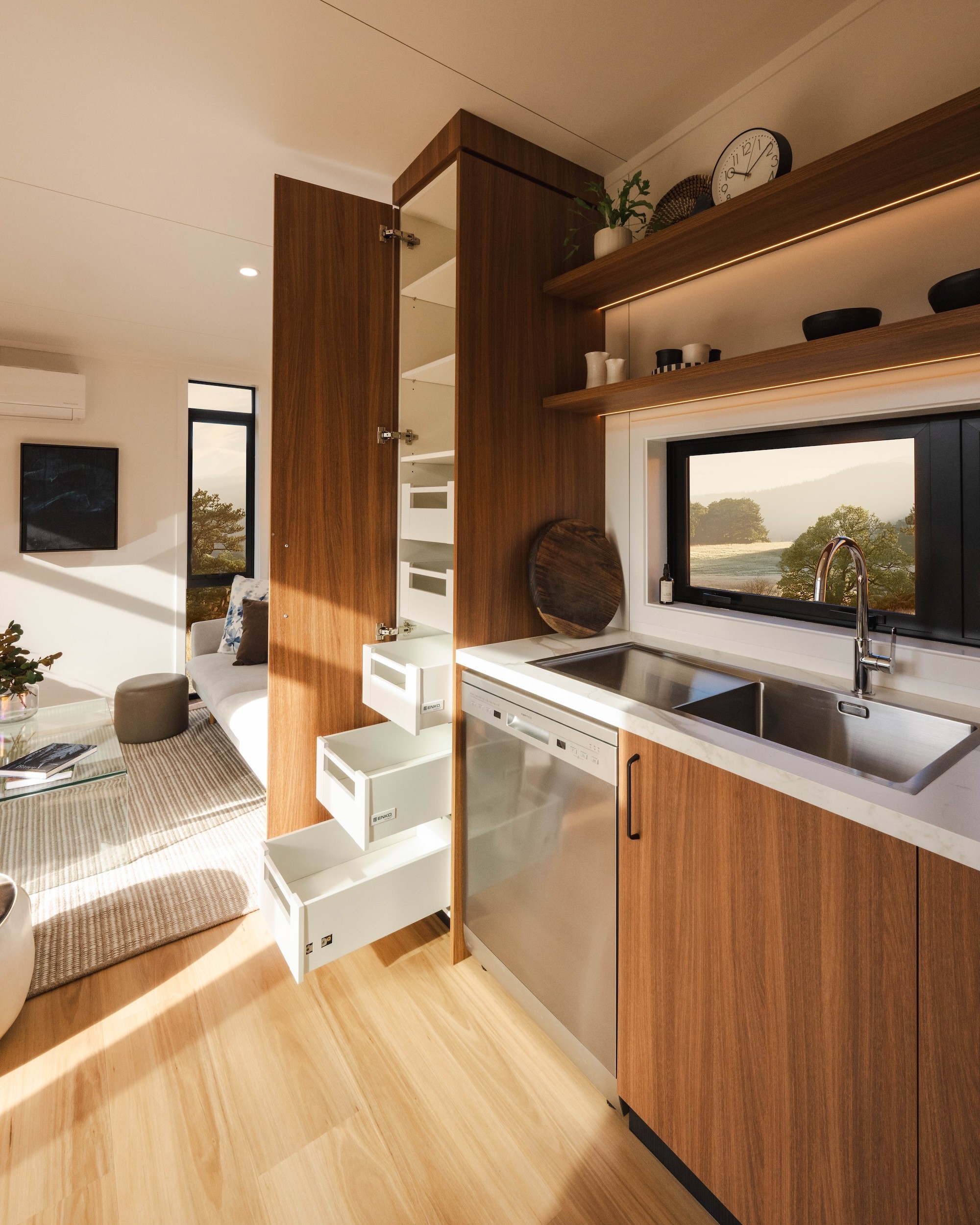 The Abel's open-plan design creates natural zones whilst maintaining visual connection throughout. Timber flooring flows seamlessly from kitchen to living areas, whilst the timber ceiling in the bedroom adds warmth and defines the sleeping space. Large sliding glass doors can open completely to extend living onto the deck.