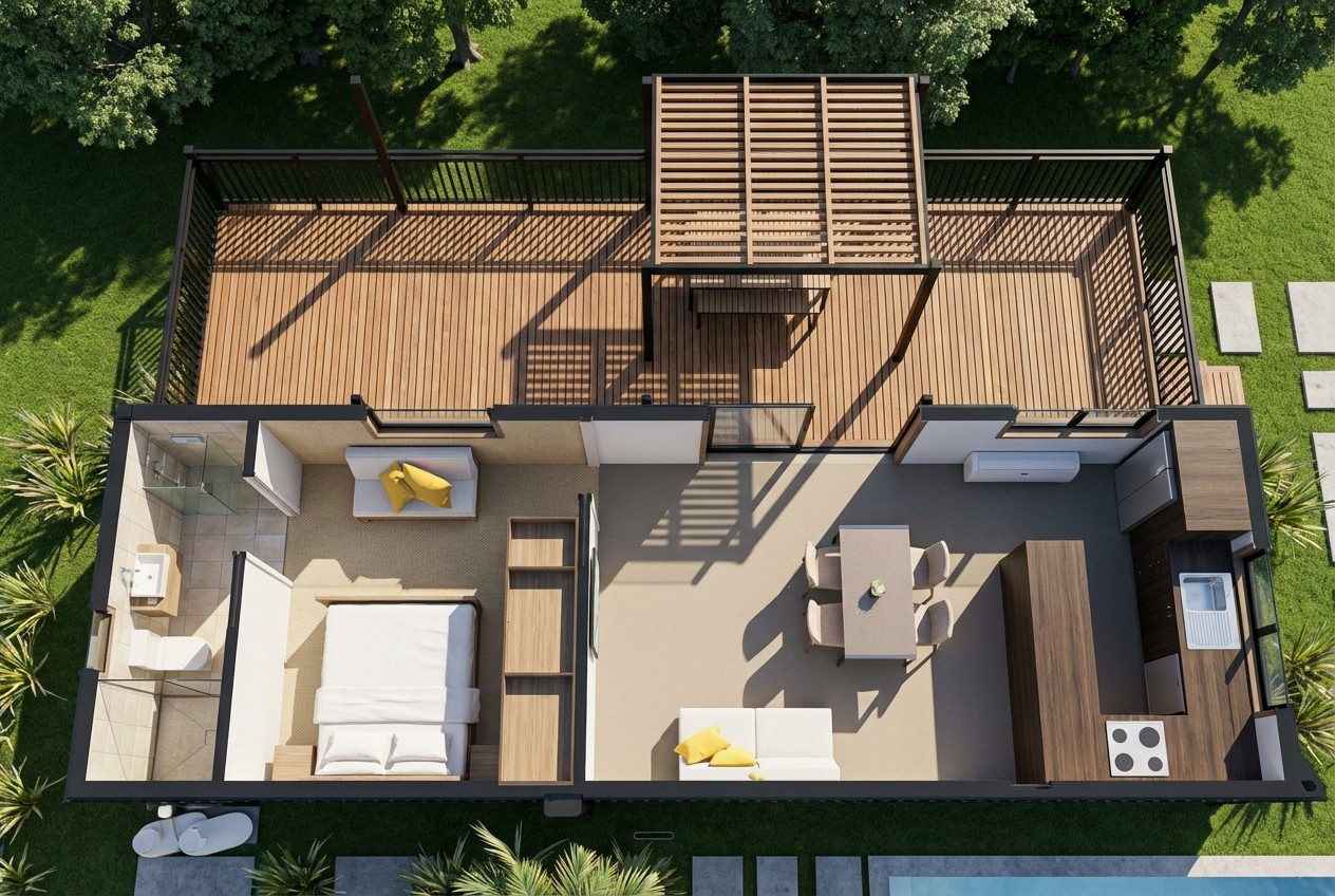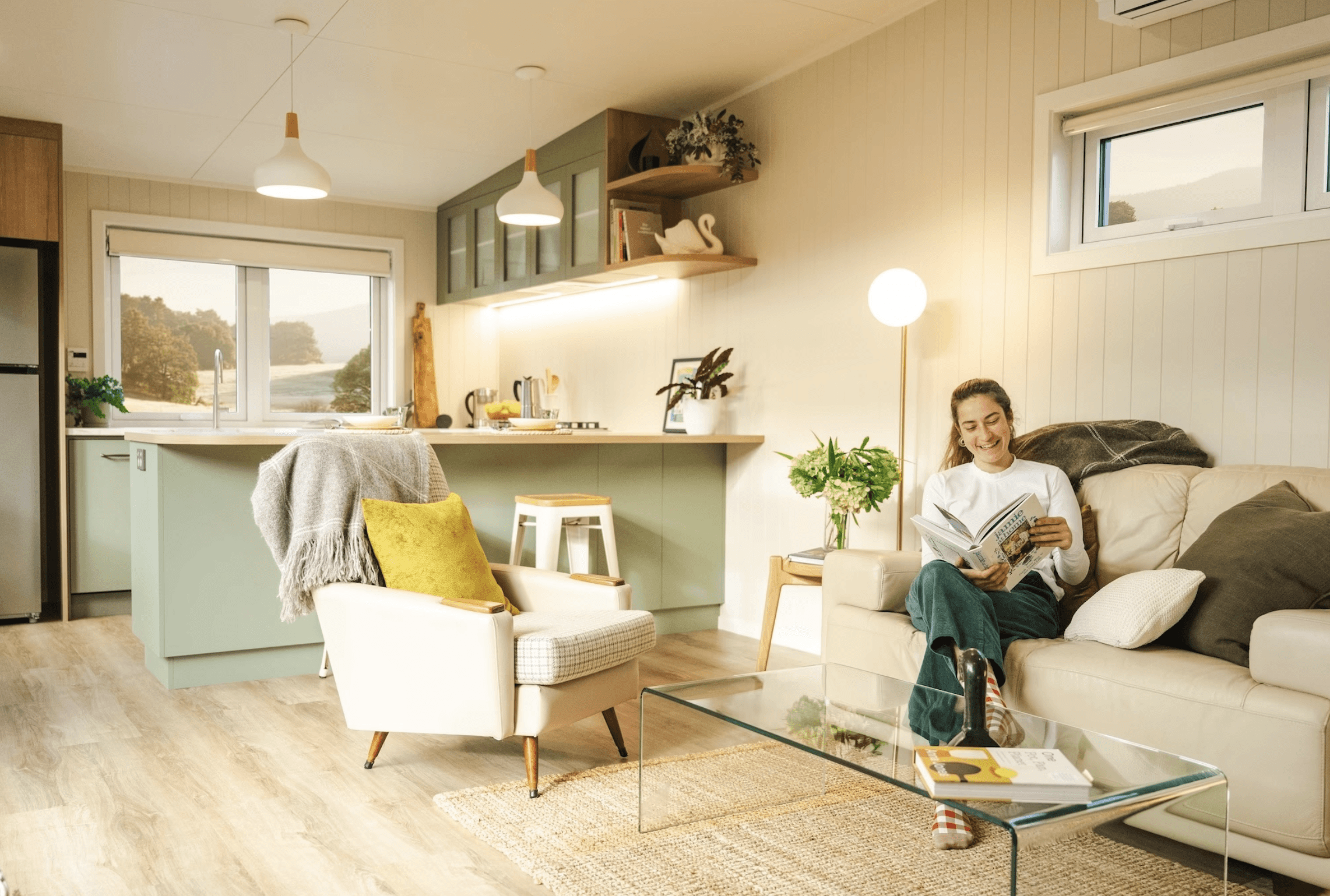 A 48m² single-level home designed for those who refuse to compromise. The Abel features a bespoke kitchen by The Sellers Room with full-size appliances, a spacious master bedroom with king-bed capacity and full-length wardrobing, plus a flexible second room for office or guest space. Floor-to-ceiling architectural windows flood the open-plan living area with natural light, while premium bathroom fixtures and smart storage solutions ensure everyday comfort.