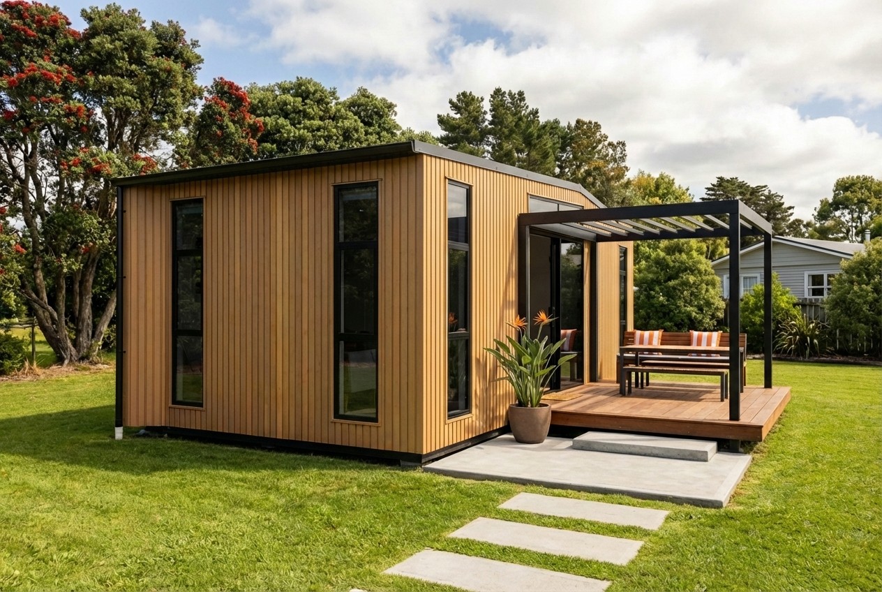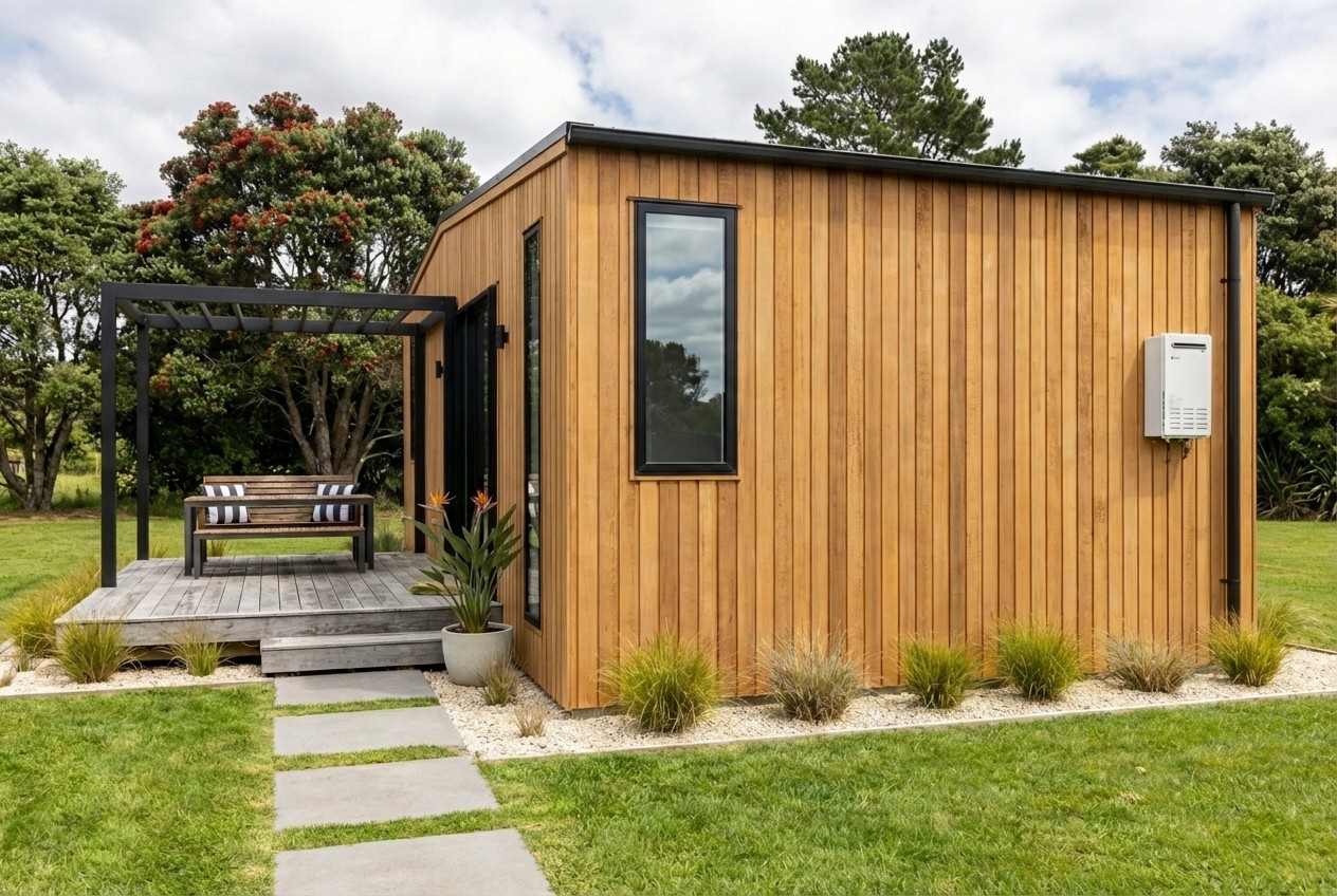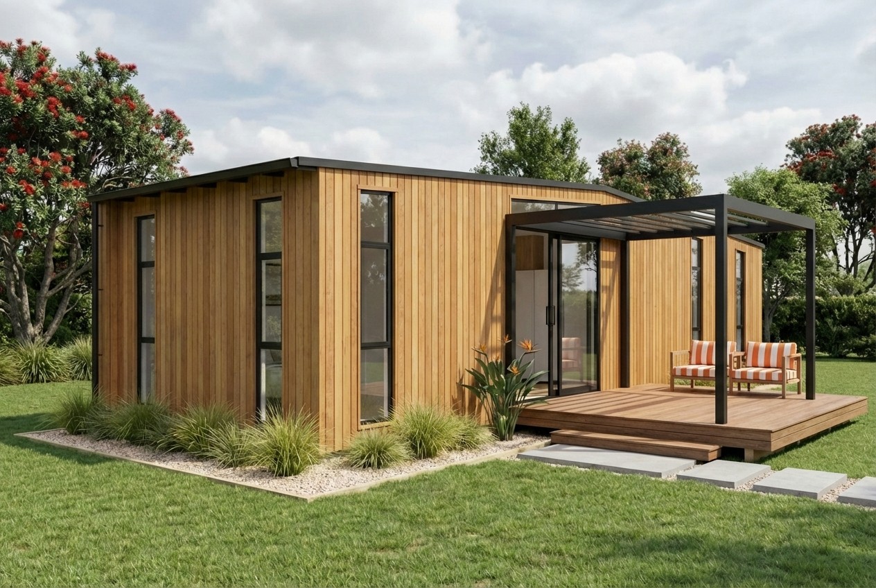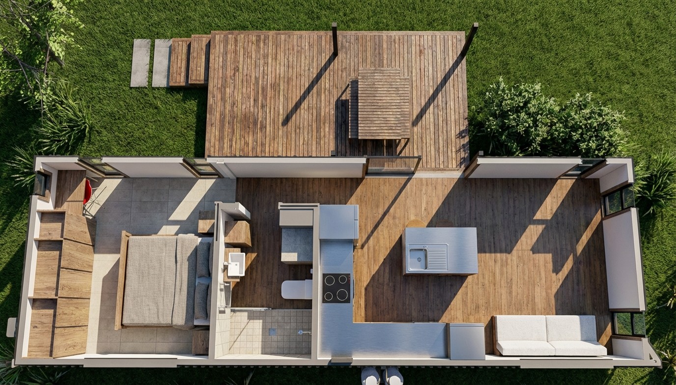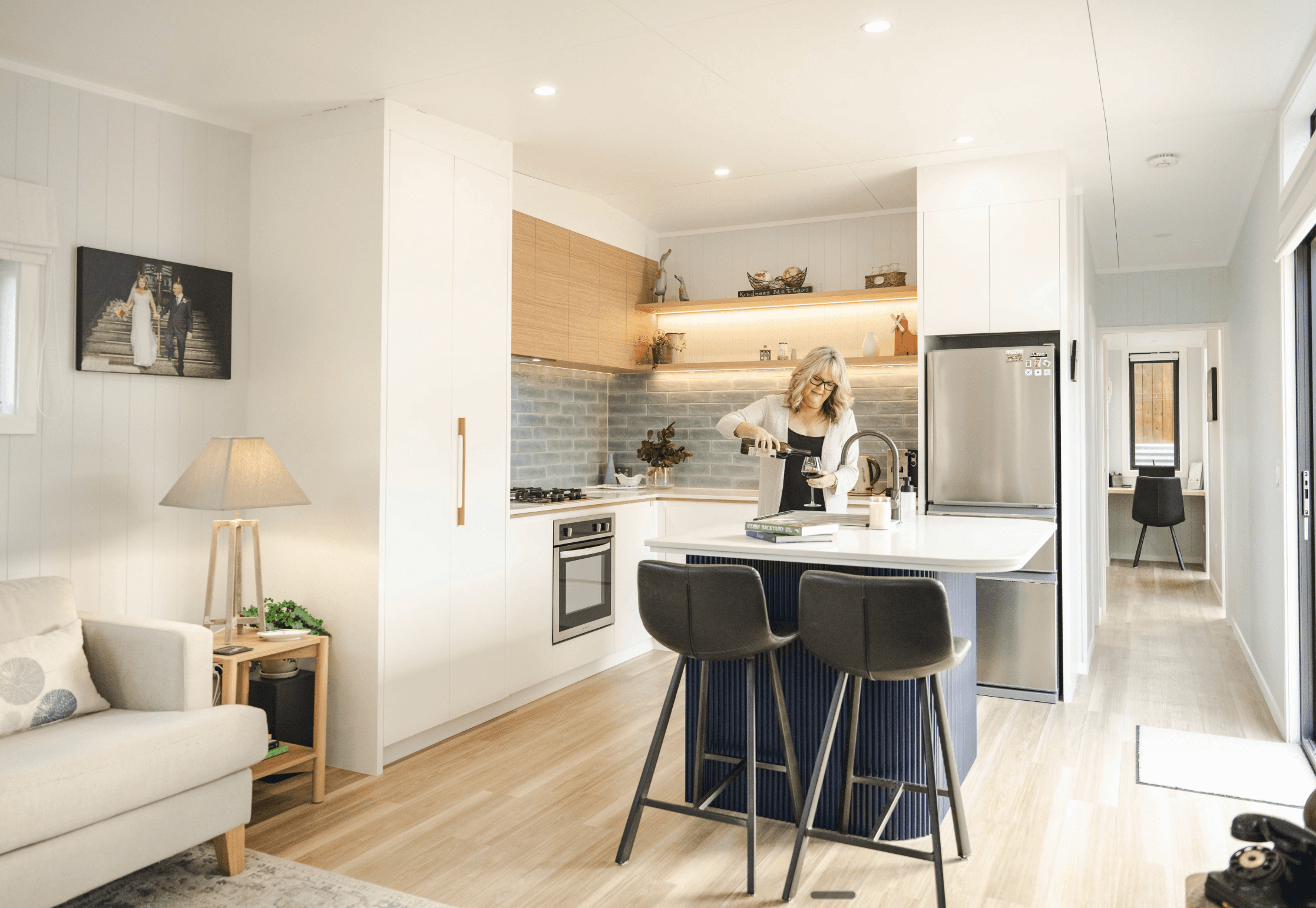 A 48m² single-level home inspired by relaxed coastal living. The Willow features a king-size compatible master bedroom with built-in office nook, a show-stopping 1800mm walk-in shower, and floor-to-ceiling windows that frame your surroundings. The bespoke kitchen with centre island creates the heart of this light-filled home, perfect for those seeking everyday luxury.